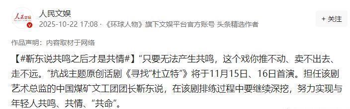 “名不正则言不顺。”2025年10月22日,《人民日报》一则话剧报道悄然将“演员靳东”改为“中国煤矿文工团团长靳东”。这七字之差,比当年他演《伪装者》明楼时的眼神更犀利——陈道明2003年说的“演员要沉心打磨”,如今在靳东身上应验了!可这称呼变更,是官方认证的“身份升级”,还是给浮躁娱乐圈的一记警钟?咱们得掰扯掰扯——毕竟,不是所有演员都能扛起“团长”二字背后的责任。